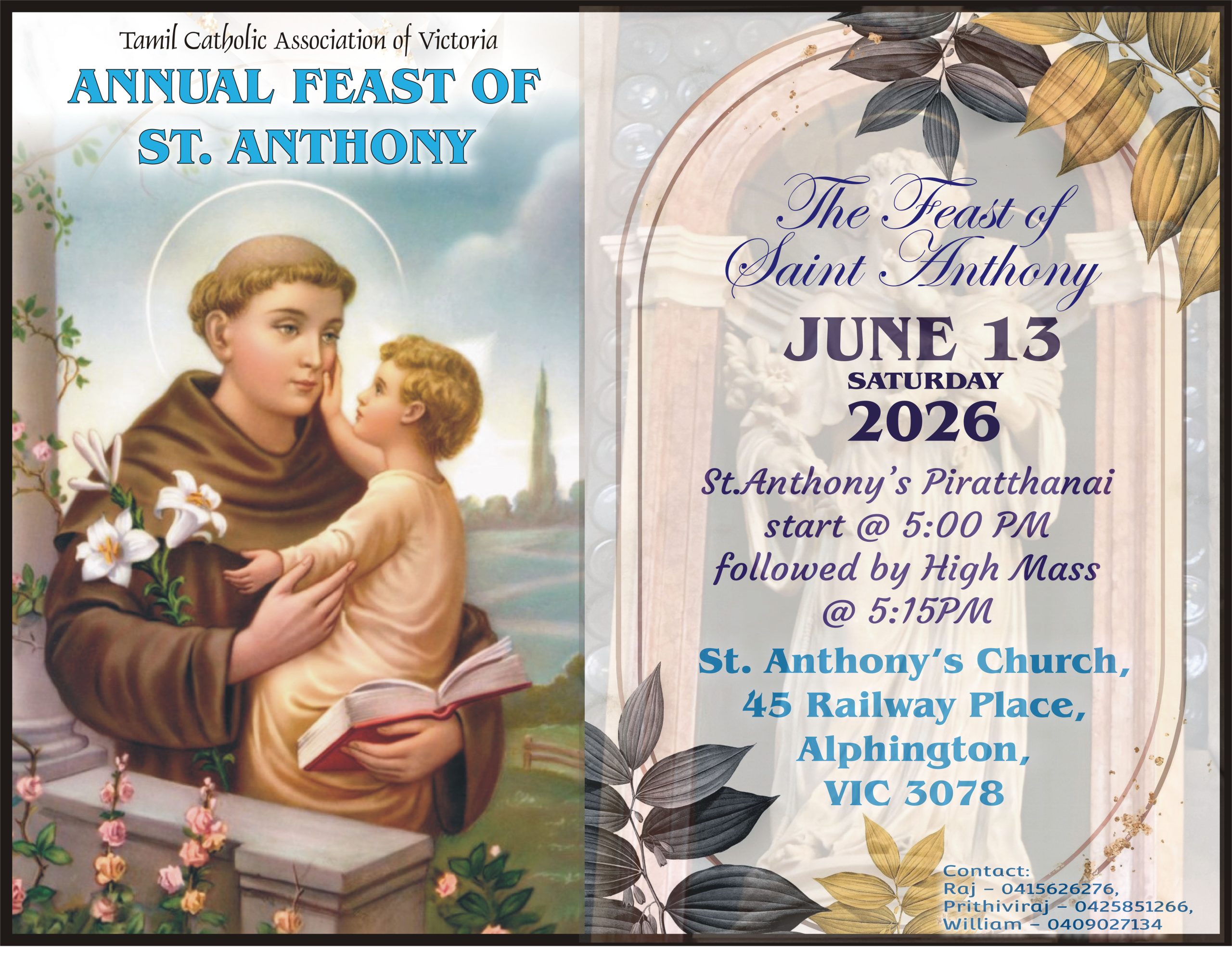Name of Account Holder – “Tamil Catholic Association of Victoria” Bank, State & Branch (BSB) No. – 06 3245 Account Number – 10031975.